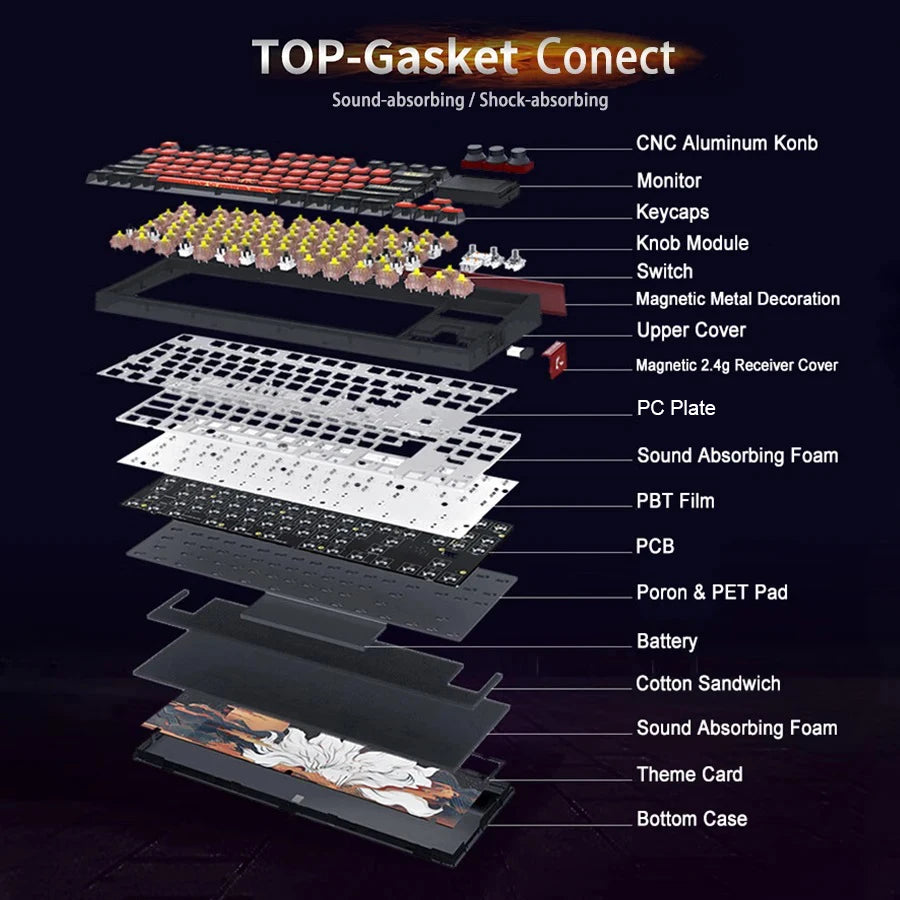 Package: GK87 Pro keyboard*1 (3 knobs and screen installed), dust cover*1, 2-in-1 keycap/switch puller*1, screen spudger*1, extra switches, extra keycaps, decorative sheet*1 , Type-A adapter*1, 2.4G wireless receiver*1, USB-C cable*1, satellite switch*1, user manual (Chinese and English).